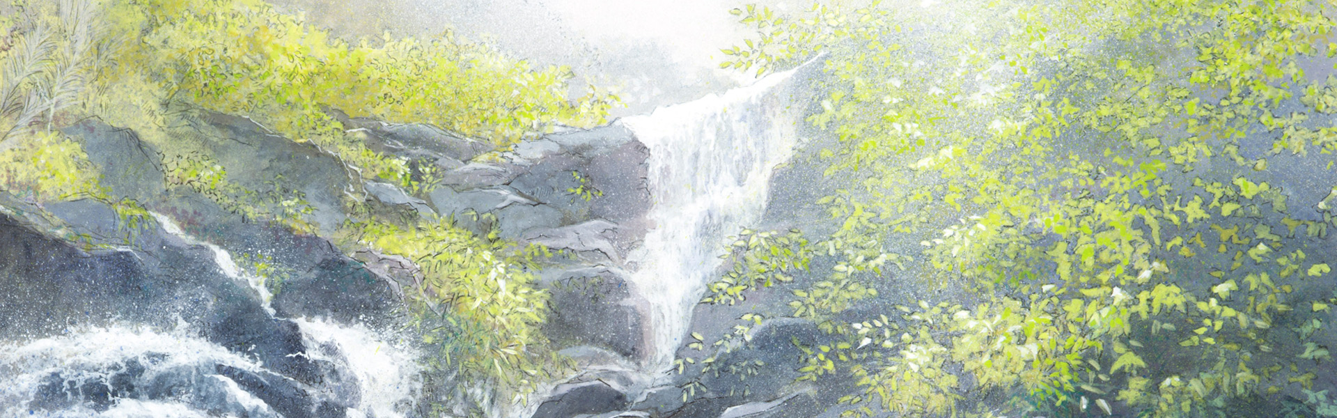 滝の絵からは冷たい水飛沫が跳ね、森の絵からは爽やかな風が吹き、渓流のそれからは涼やかな音が聞こえてくる。横尾の描く絵はその中へ、見ている者を強く引き込む。見て楽しむ=観賞を超えて、味わう=鑑賞することになる。花の絵の前に立てば、描写された空間に引きずり込まれ、豊かな香りに包まれる。