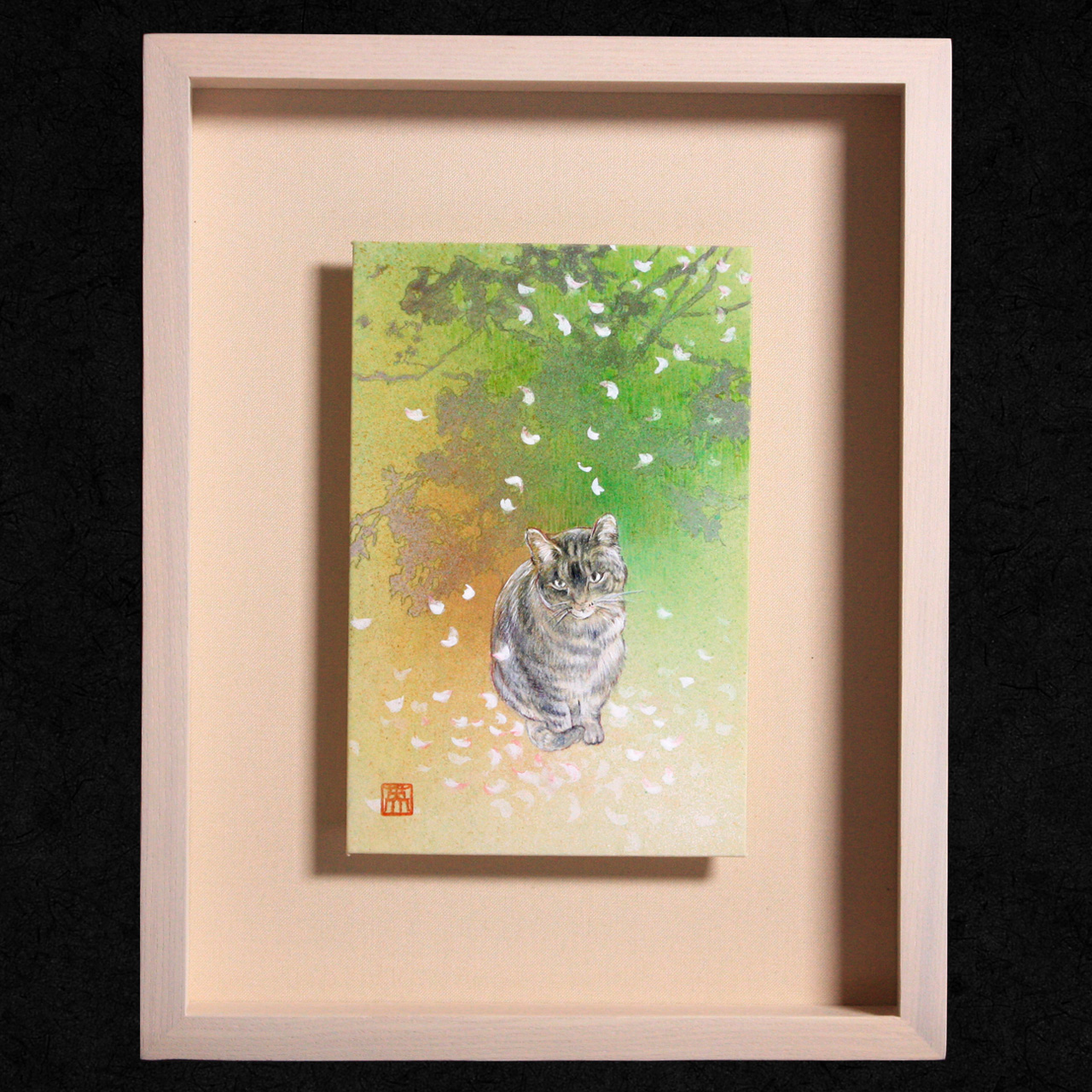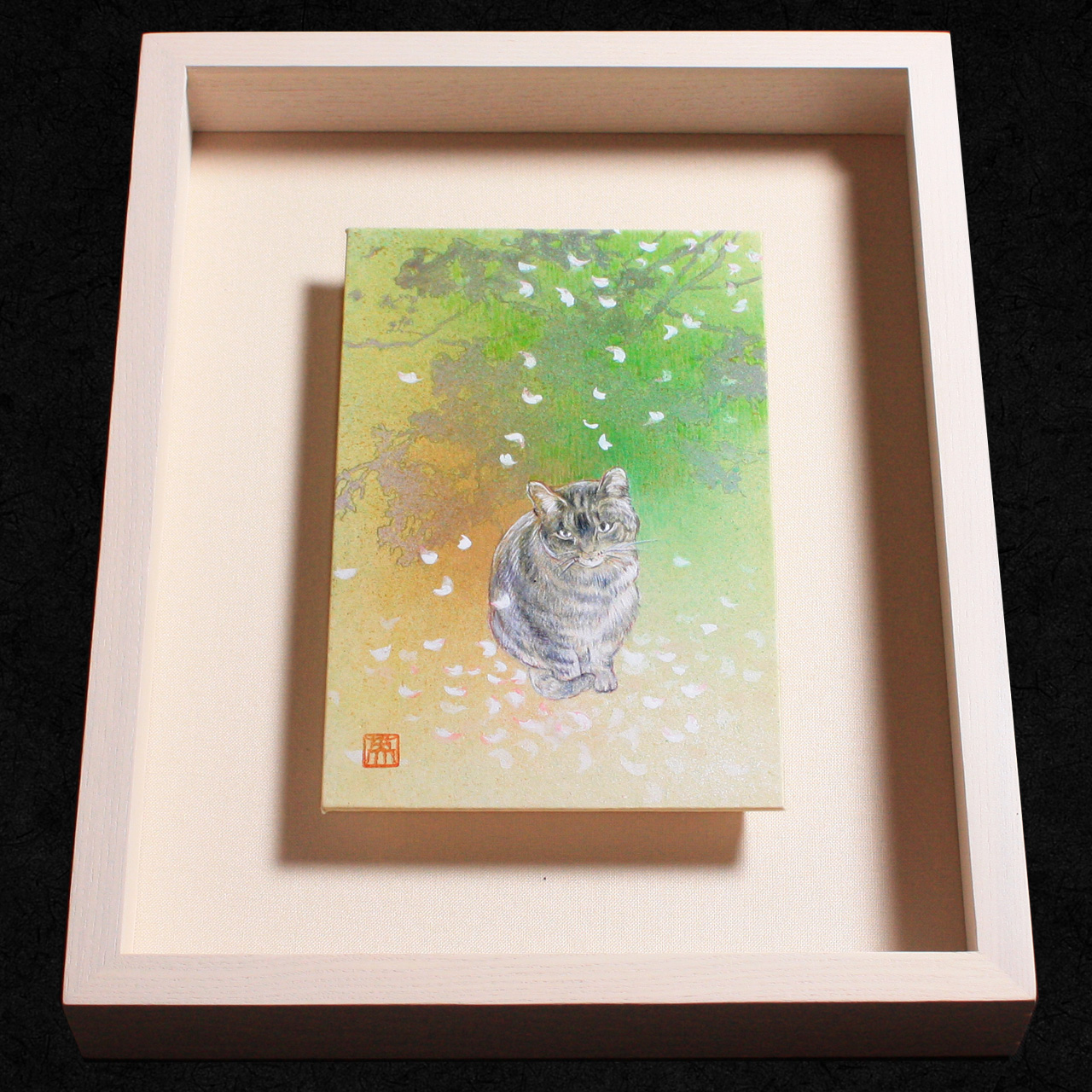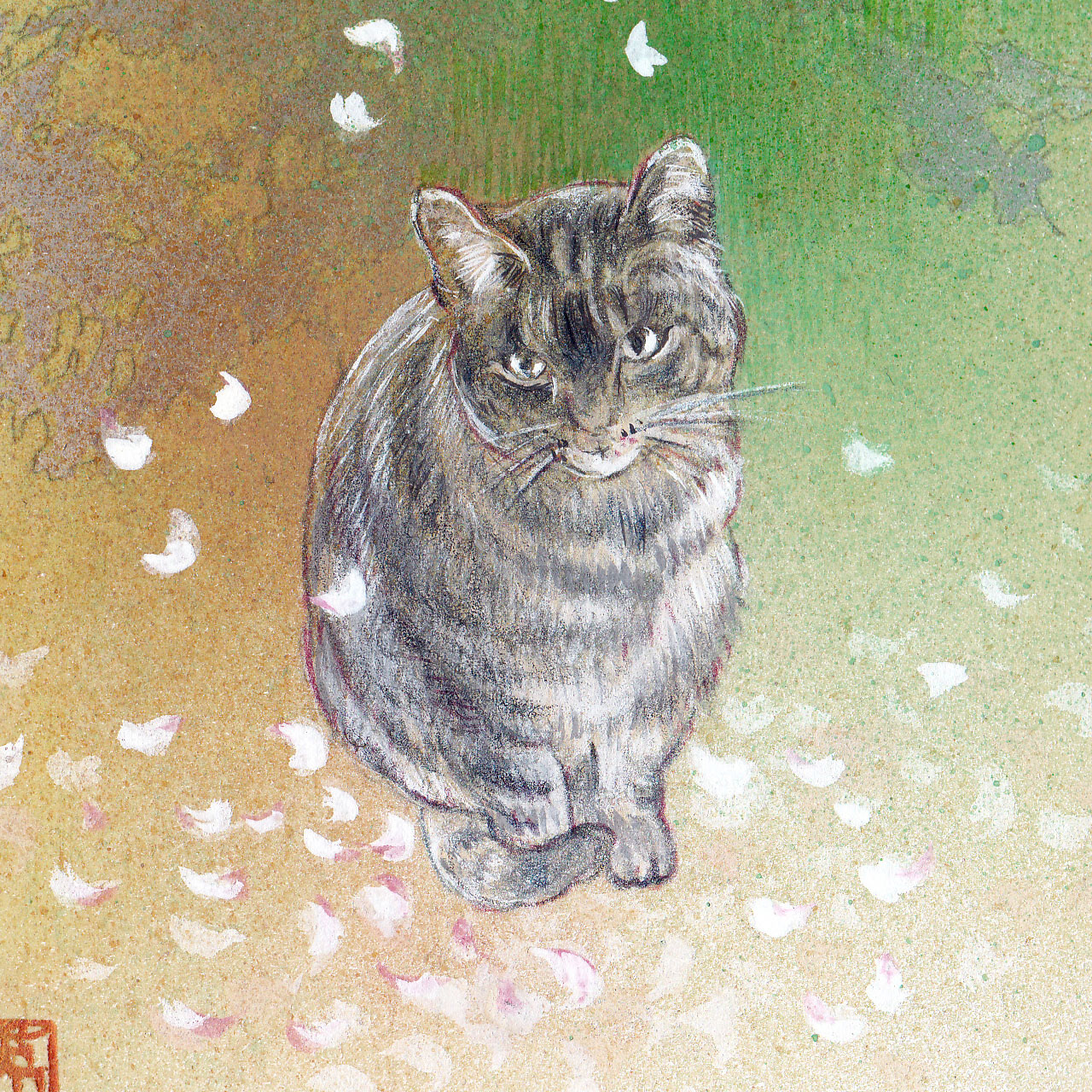 思わず口元を緩めて微笑んでしまうような柔らかい空気感をまとった作品です。触りたくなるような猫の質感は、横尾英子が得意とする『花画』の優しく柔らかい表現に通ずるものがあります。