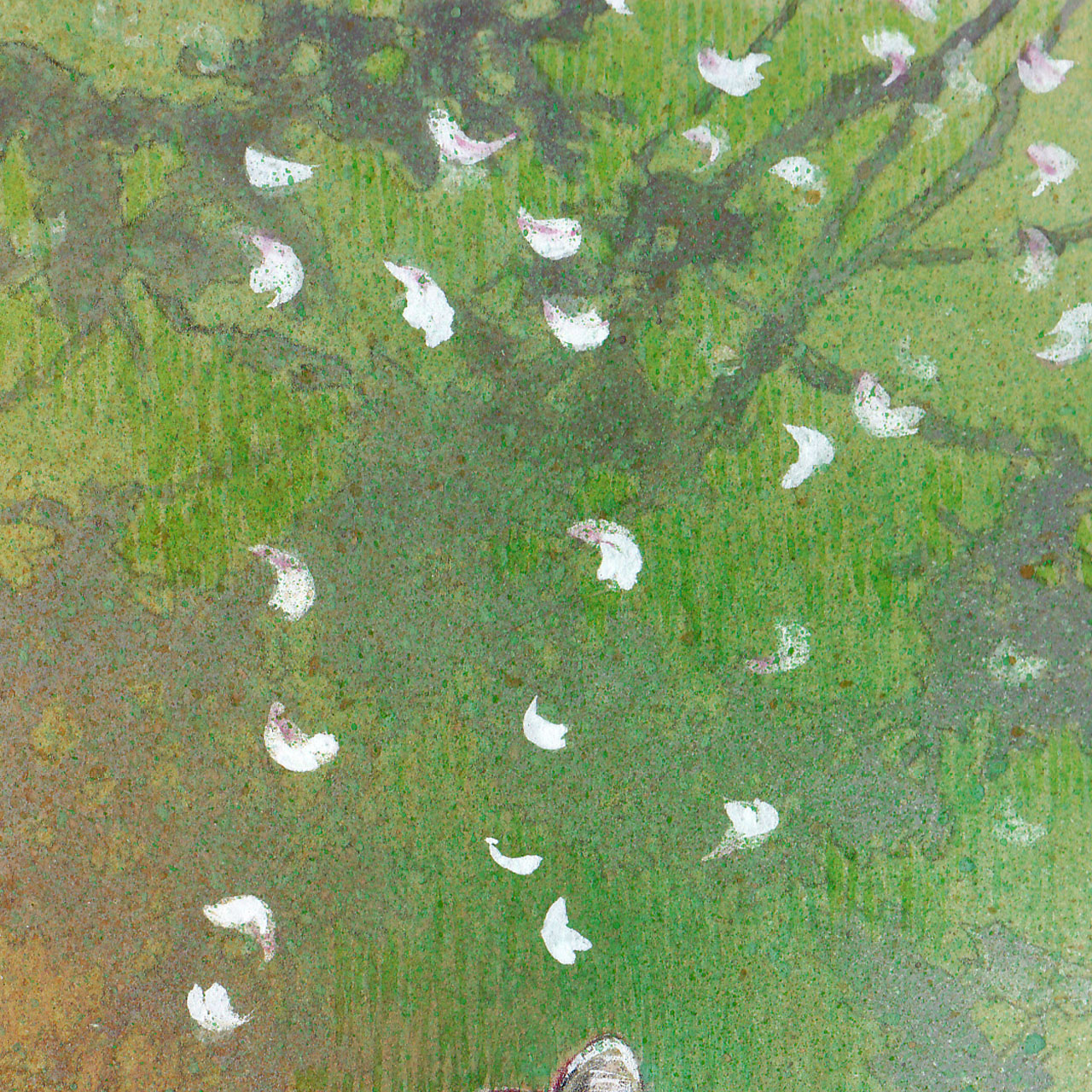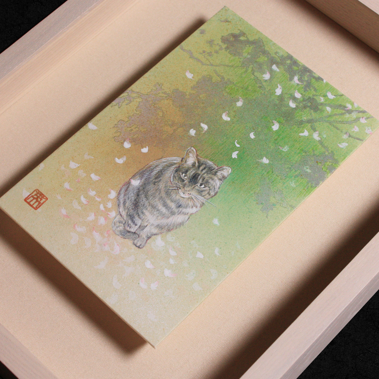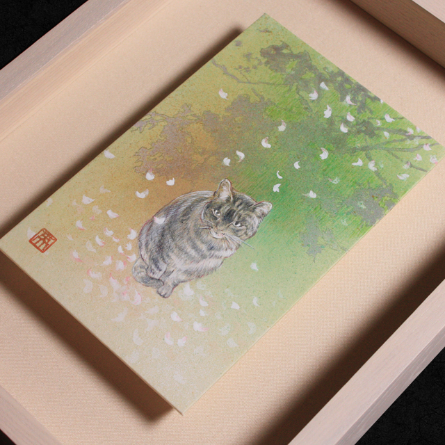 思わず口元を緩めて微笑んでしまうような柔らかい空気感をまとった作品です。触りたくなるような猫の質感は、横尾英子が得意とする『花画』の優しく柔らかい表現に通ずるものがあります。
