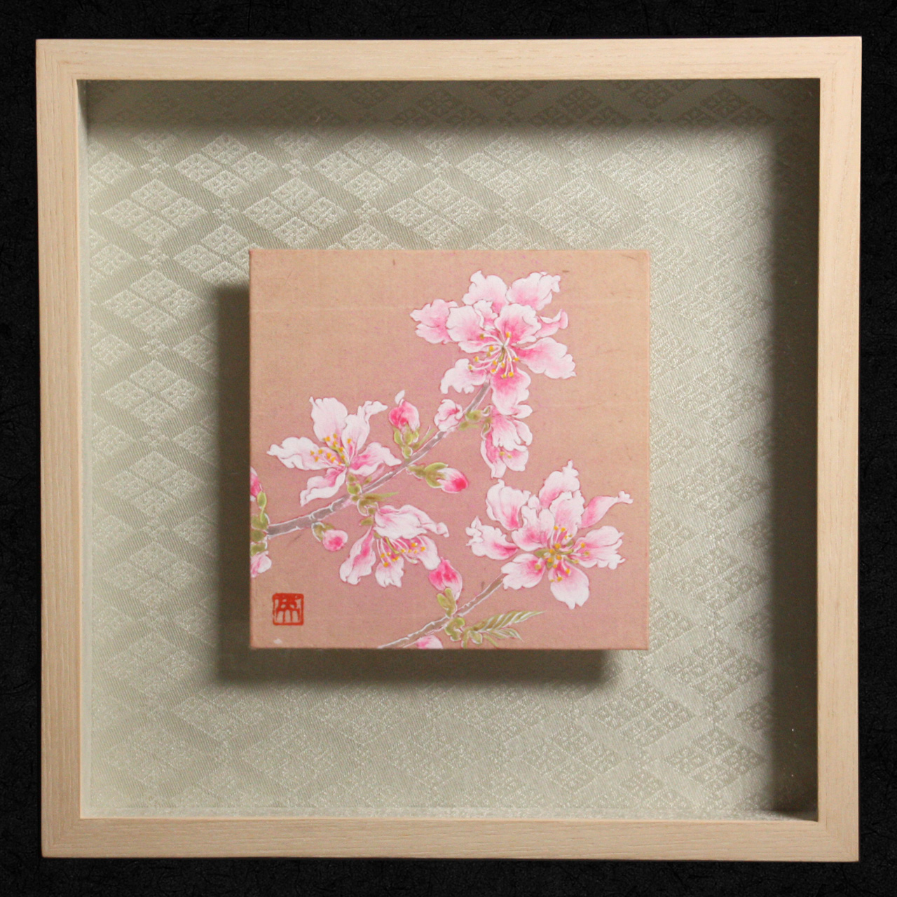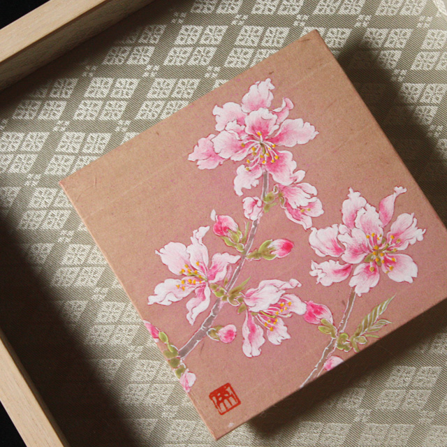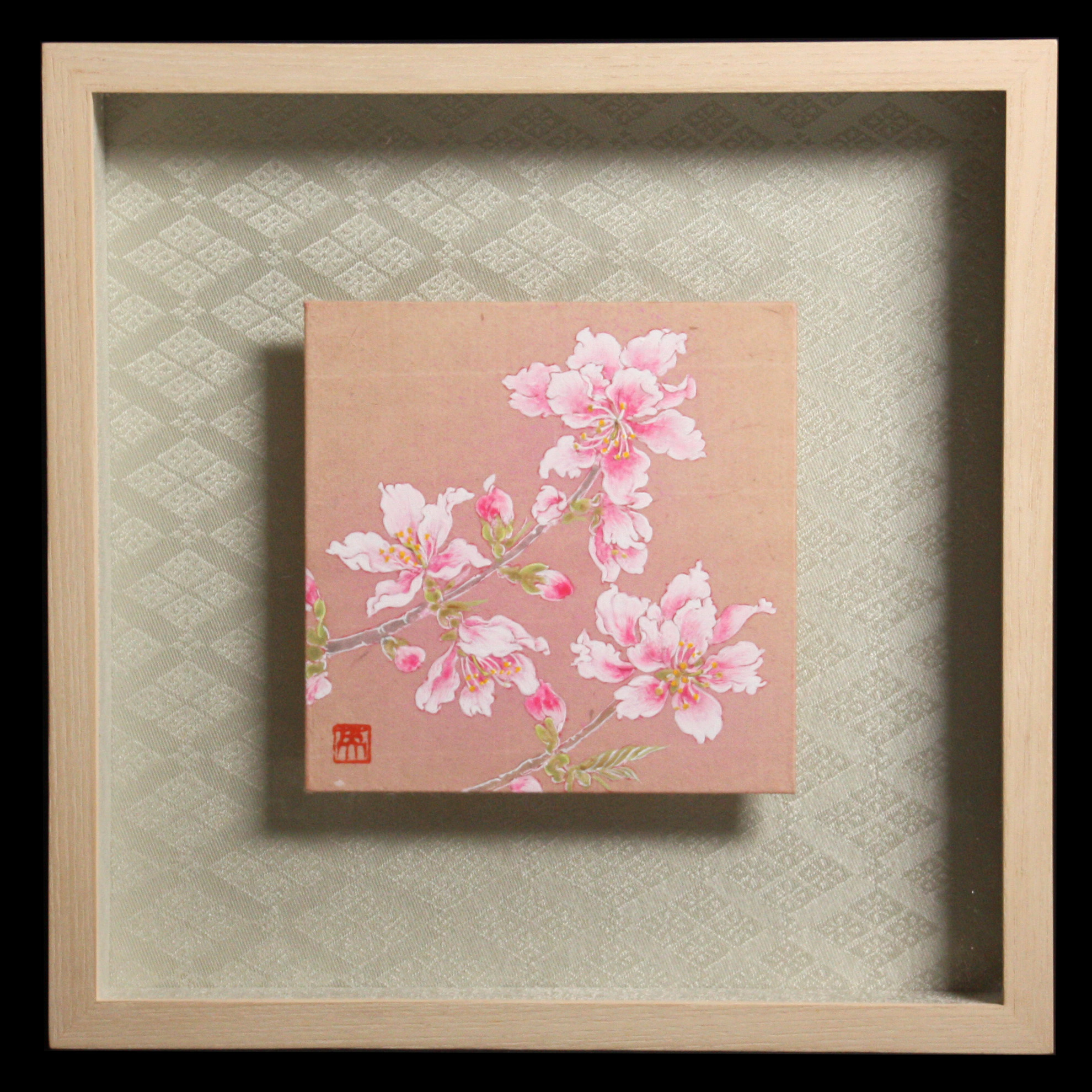 横尾英子が気に入って、自分のために秘蔵しているものの中から特別に提供してくれた品です。桜の樹液で染められた細川紙を基底材に、その地色を生かして描かれています。しかも作家たちが信頼を寄せる表具店・数寄和による額装が施され、裂(きれ)と言われる織物を使った上品で深みのあるマットにより、愛らしい桃の花がさらに引き立っています。