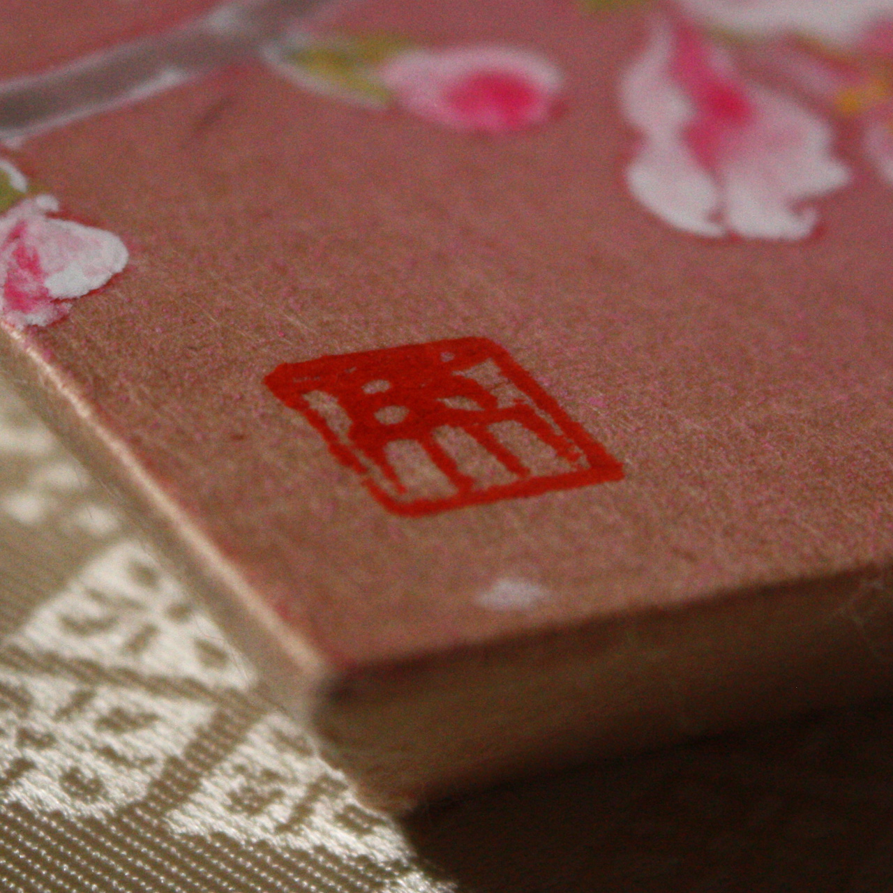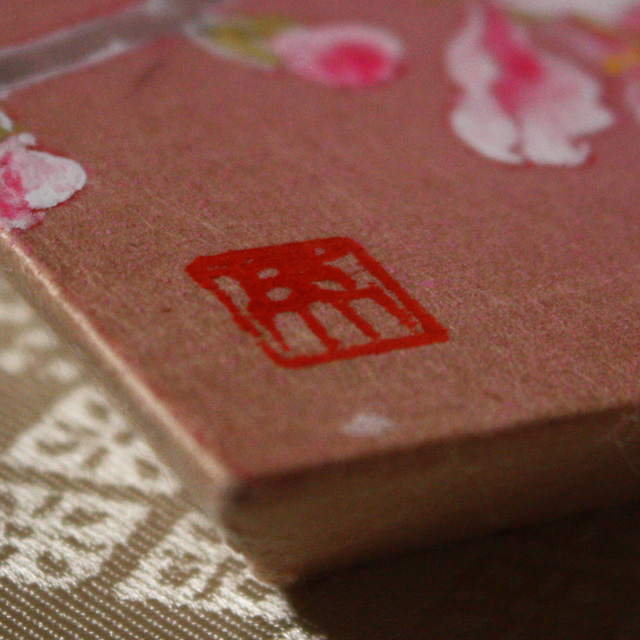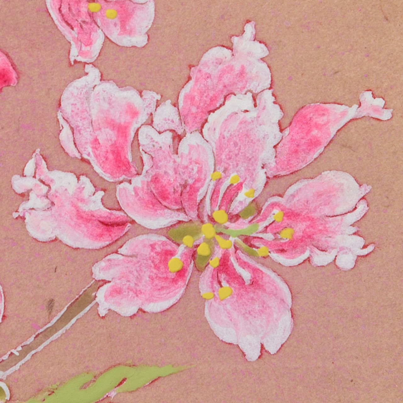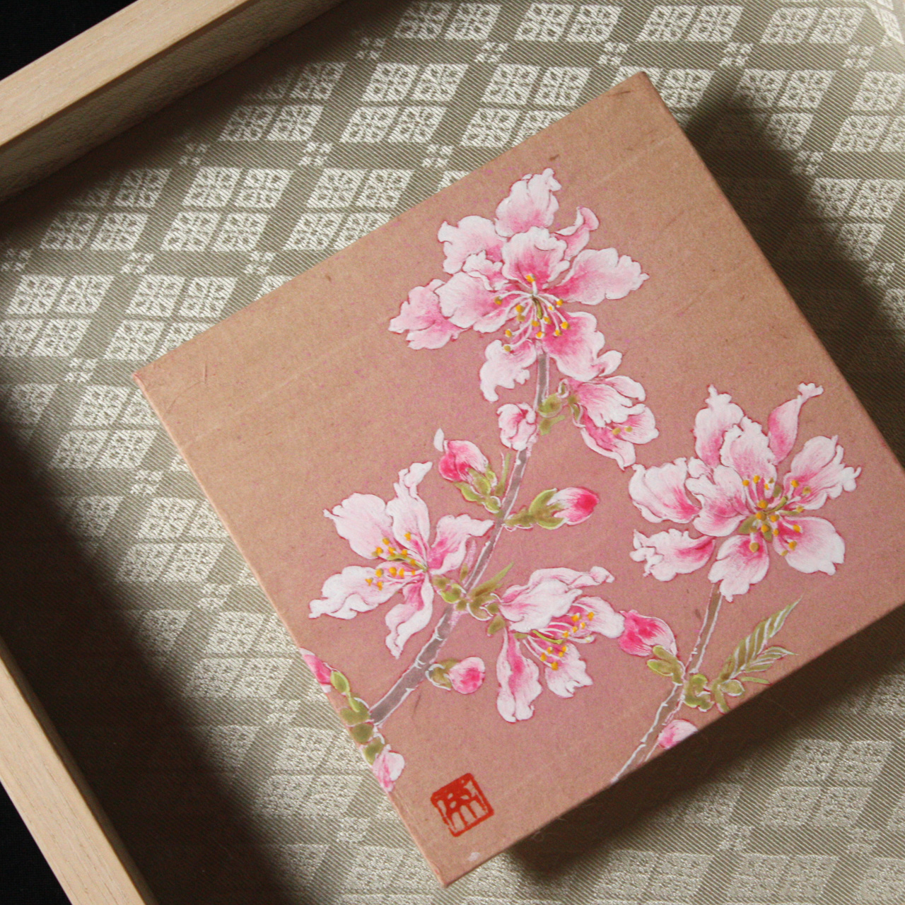 横尾英子が気に入って、自分のために秘蔵しているものの中から特別に提供してくれた品です。桜の樹液で染められた細川紙を基底材に、その地色を生かして描かれています。しかも作家たちが信頼を寄せる表具店・数寄和による額装が施され、裂(きれ)と言われる織物を使った上品で深みのあるマットにより、愛らしい桃の花がさらに引き立っています。