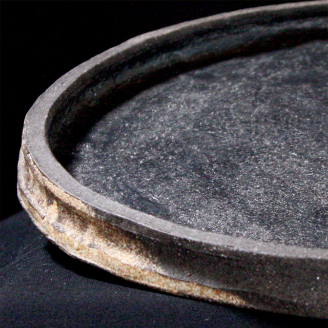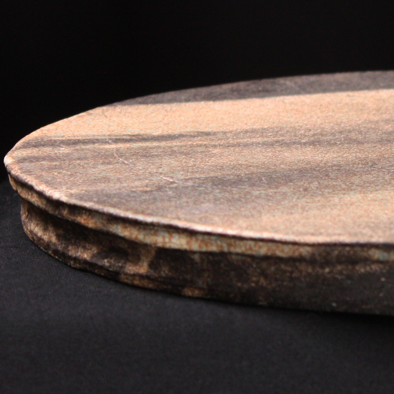 表と裏の両面で違ったイメージを楽しめる一器二用途の“器”です。表面と側面は土の素材感を生かし白い泥漿で表情をつける、千田玲子の得意とする技法が発揮されています。裏面は縁付きの“器”となっています。千田の作るリバーシブルの台皿のなかでは中サイズくらいのもので、様々な用途に使いやすい大きさではないでしょうか。